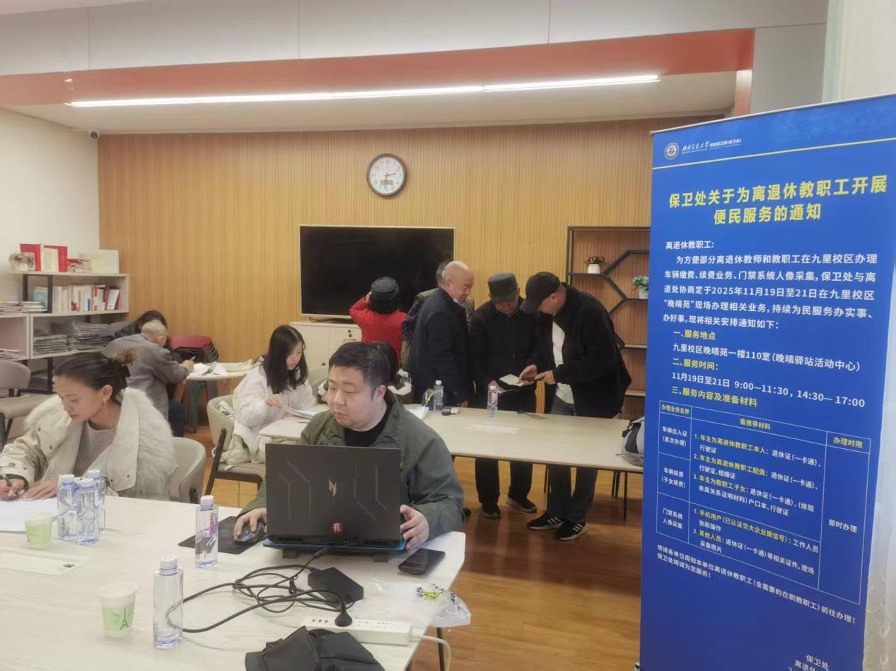 为方便九里校区部分离退休教师和教职工办理校园车辆相关业务,保卫处与离退处主动靠前服务,于11月19日至21日期间,在九里校区晚晴苑设立临时服务点现场办公,为离退休职工办理个人及子女车辆、人脸信息采集等相关业务。