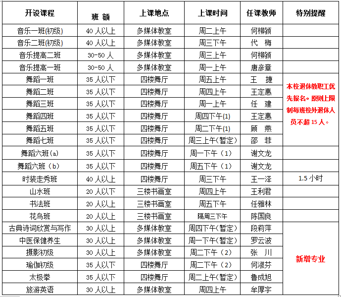 2、调课说明:因特殊情况需要调班、调课的学员,须在开课第一周内在老年大学办公室提出申请,完成调整工作,两周后一律不予办理调课、调班手续。