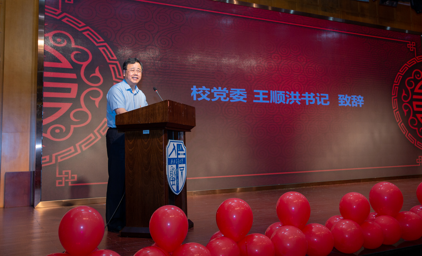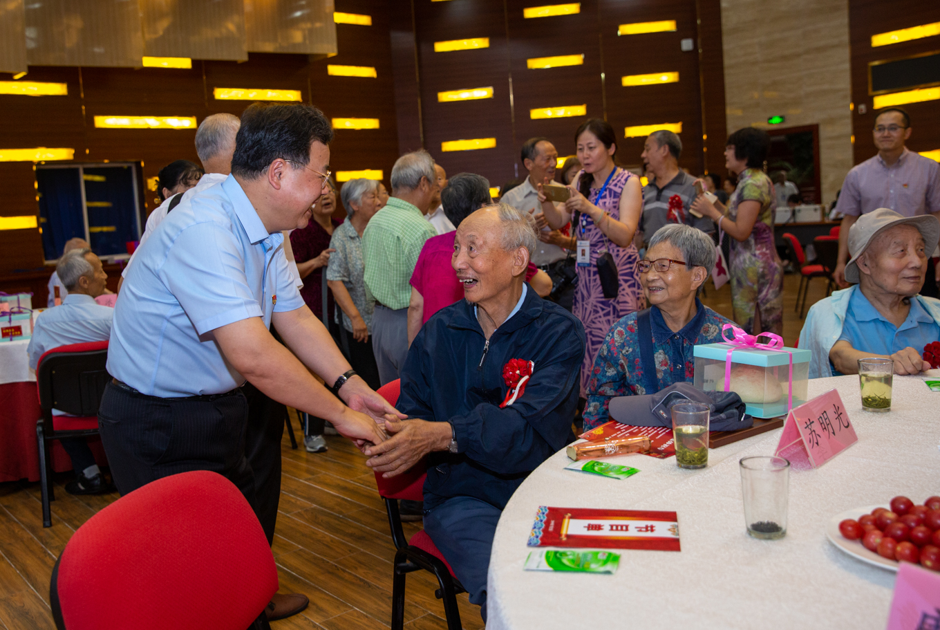 7月2号下午,为迎接祖国70华诞,同时为今年年满70周岁、80周岁、90周岁及90岁以上的离退休教职工过集体生日,学校在九里校区国际会议厅举行“欢庆祖国70华诞 春华晚晴集体祝寿”活动。校党委书记王顺洪、副书记桂富强出席活动。活动由离退休工作处副处长(主持工作)廖军主持。