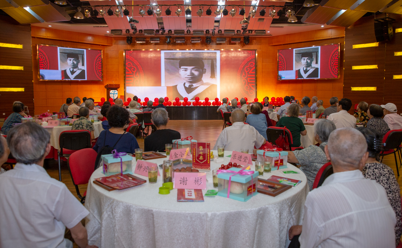 在动人的生日祝歌中,老寿星代表和学校领导一同分享离退处和成都锦欣集团精心准备的五层生日蛋糕,53位寿星的生活风采展示视频在大屏幕播放,大家在一张张黑白和彩色照片中回顾了与祖国一同成长的峥嵘岁月。