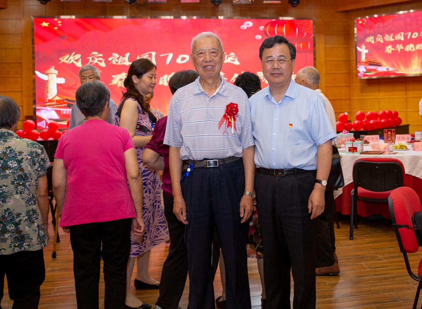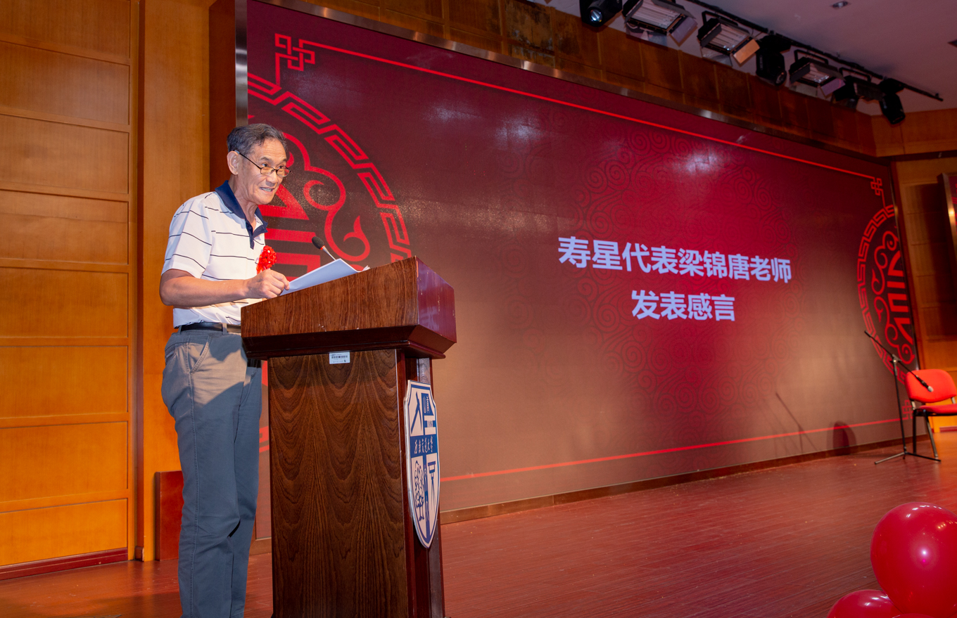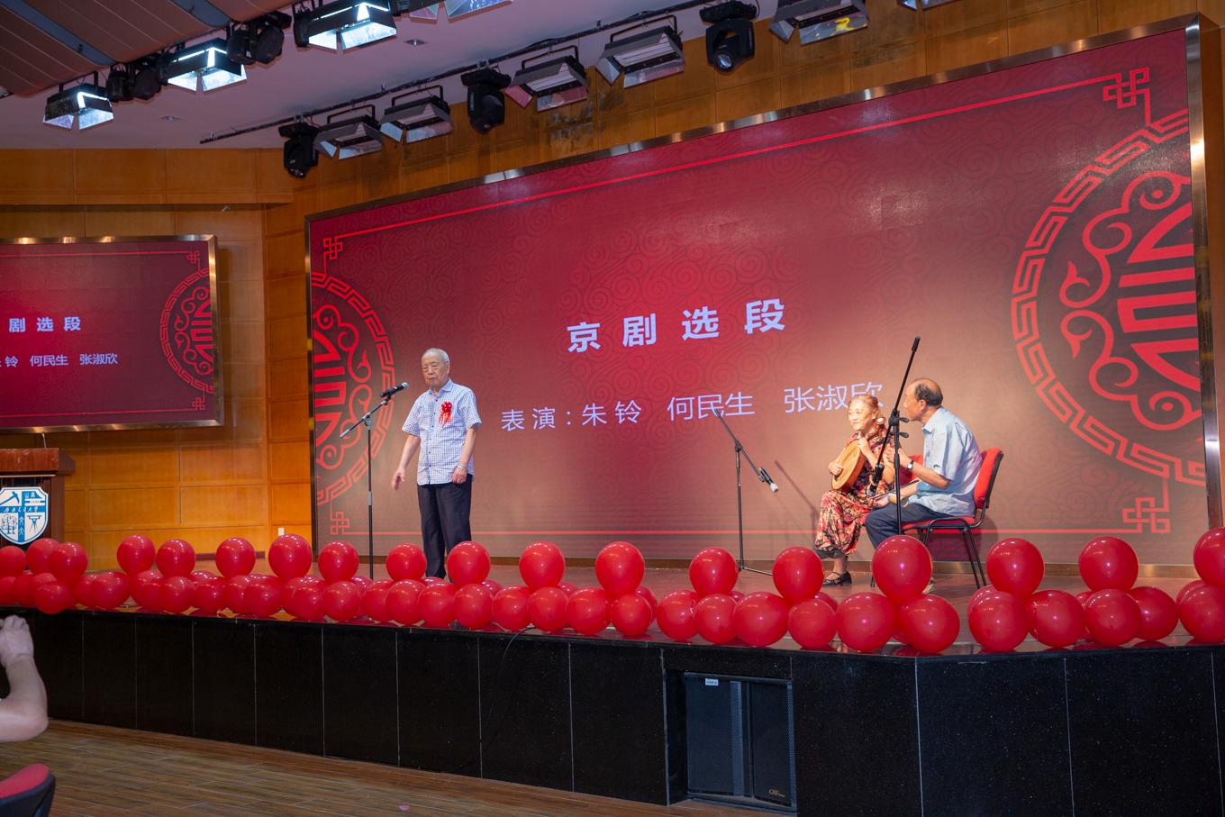 70周岁的寿星代表梁锦唐发表感言。他分享了自己出生在新中国成立这一天的趣事,回忆为祖国奋斗、与交大成长的青春时光。90岁高龄的朱铃教授献上精彩的京剧选段表演,“祖国是我们每一个人的,我们每一个人是祖国的”,朱铃教授发自肺腑的感言、高亢的京胡和京腔赢得了全场热烈的欢呼和掌声。