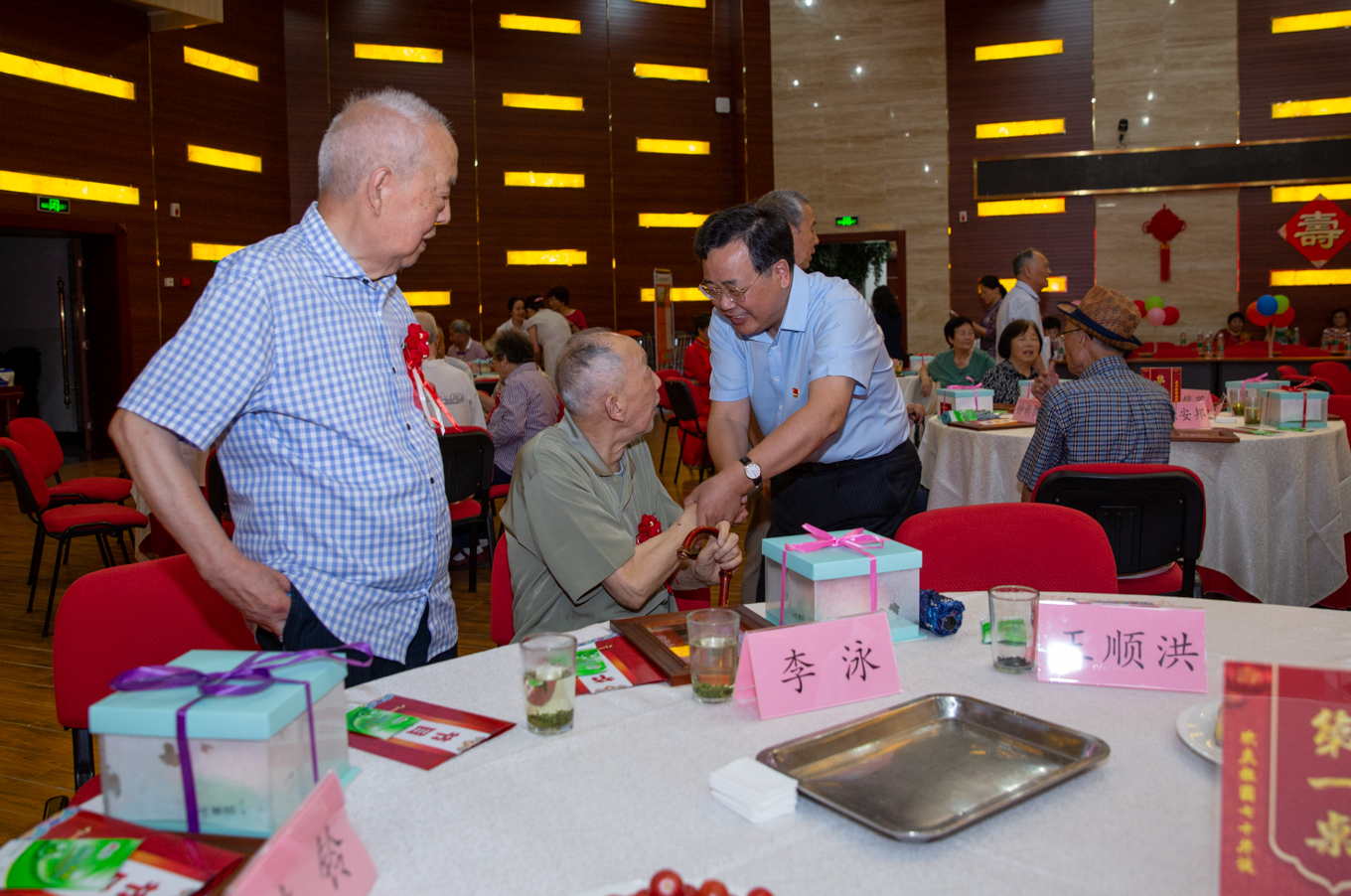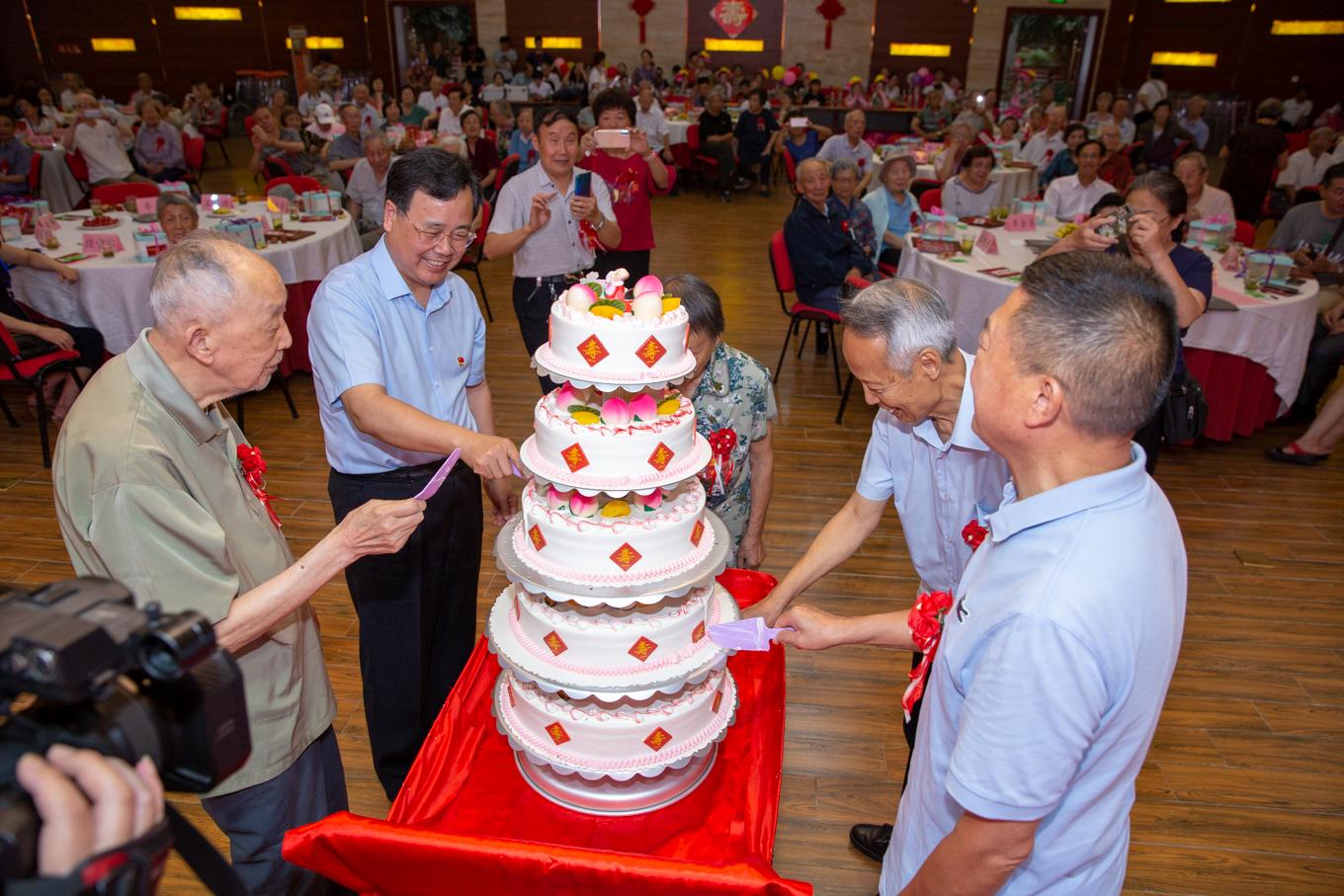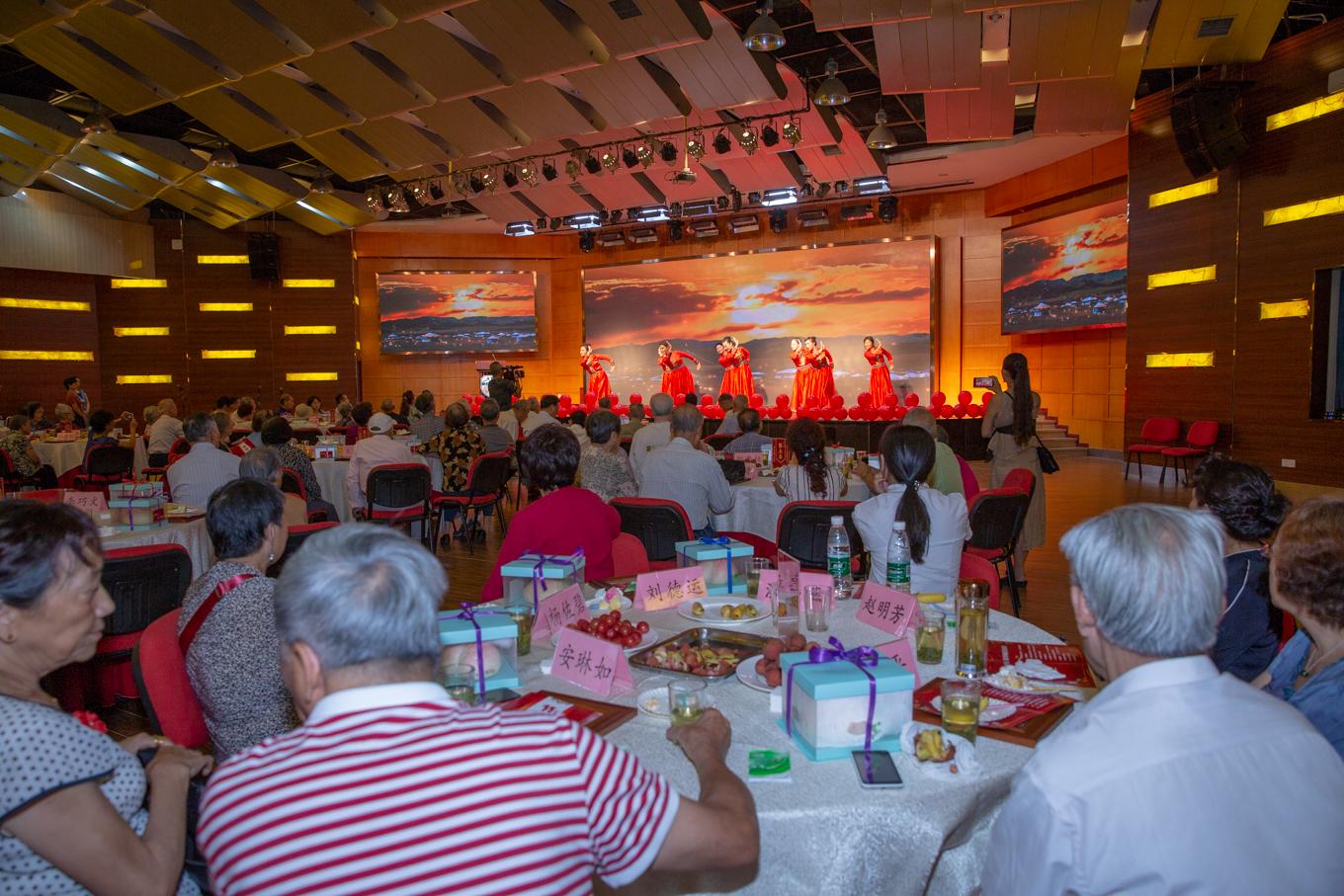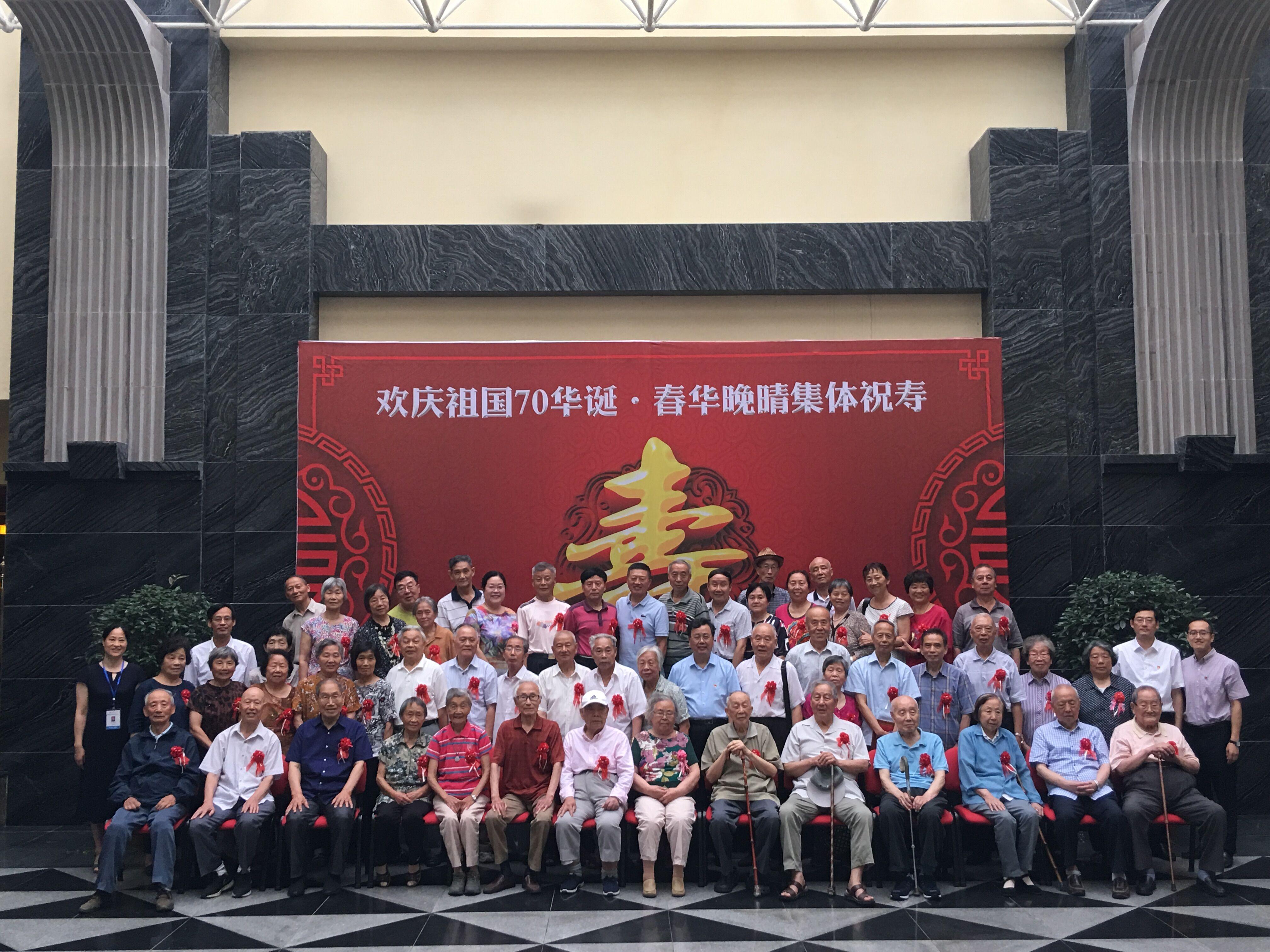 集体祝寿活动在响遍全场的《我和我的祖国》大合唱中圆满落下帷幕。53名老寿星和与会领导在大幅的“寿”墙前合影留念。