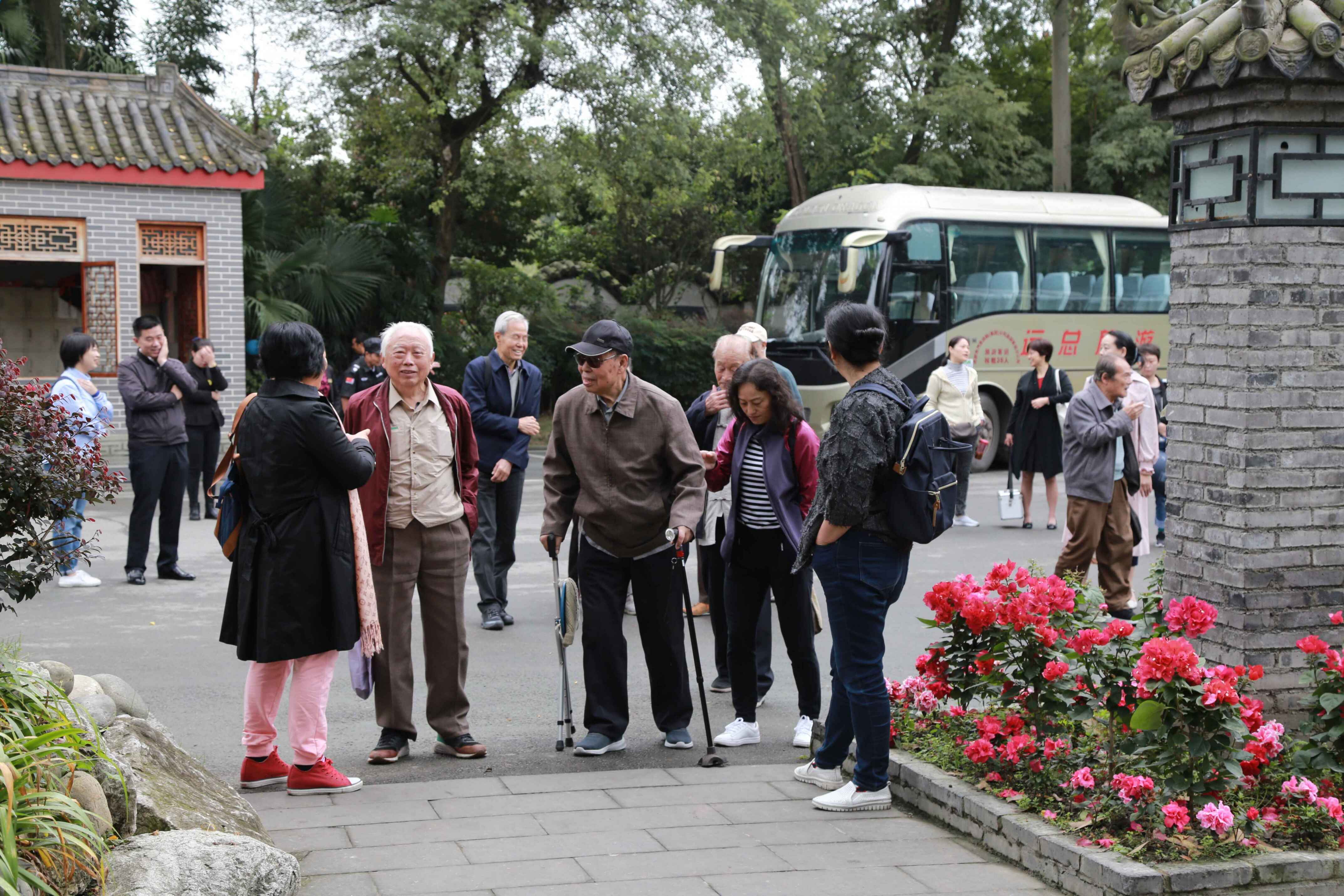 上午8点,老人们早早来到晚晴苑,大家见面无比开心,轻松交谈、相互问候,沿途欣赏着金秋的风景,纷纷肯定70年来祖国的发展、四川的发展、成都的发展,特别是农家乐带来的便利休闲,能让离退休老同志共享改革开放的成果,深切感受着学校党政的关怀。