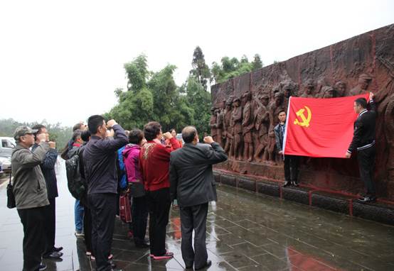 在红军长征纪念馆烈士纪念雕塑墙前,由离退处党委书记段雪芬同志领誓,面对鲜艳的党旗,全体党员重温了入党誓词,誓言铿锵,激昂回响……
