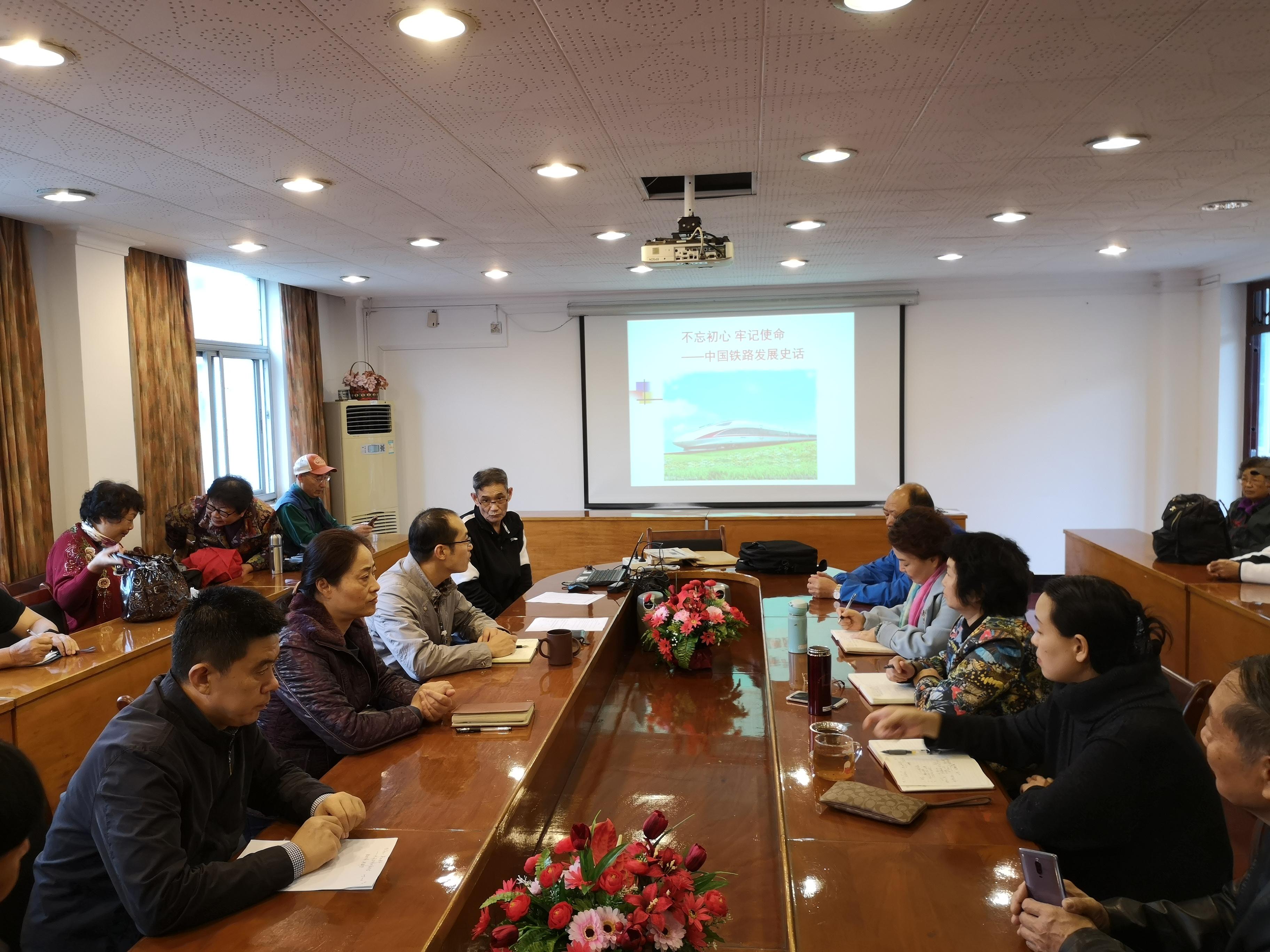 为丰富活动内容,离退处党委邀请梁锦唐老师给离退处领导班子和全校退休党支部书记做报告,报告的主题是“不忘初心、牢记使命—中国铁路发展史话”。梁锦唐结合大量真实事迹生动的为大家讲述了中国铁路的发展,让在座的每一位都能感受到祖国的发展变化,感受到祖国的交通强国。