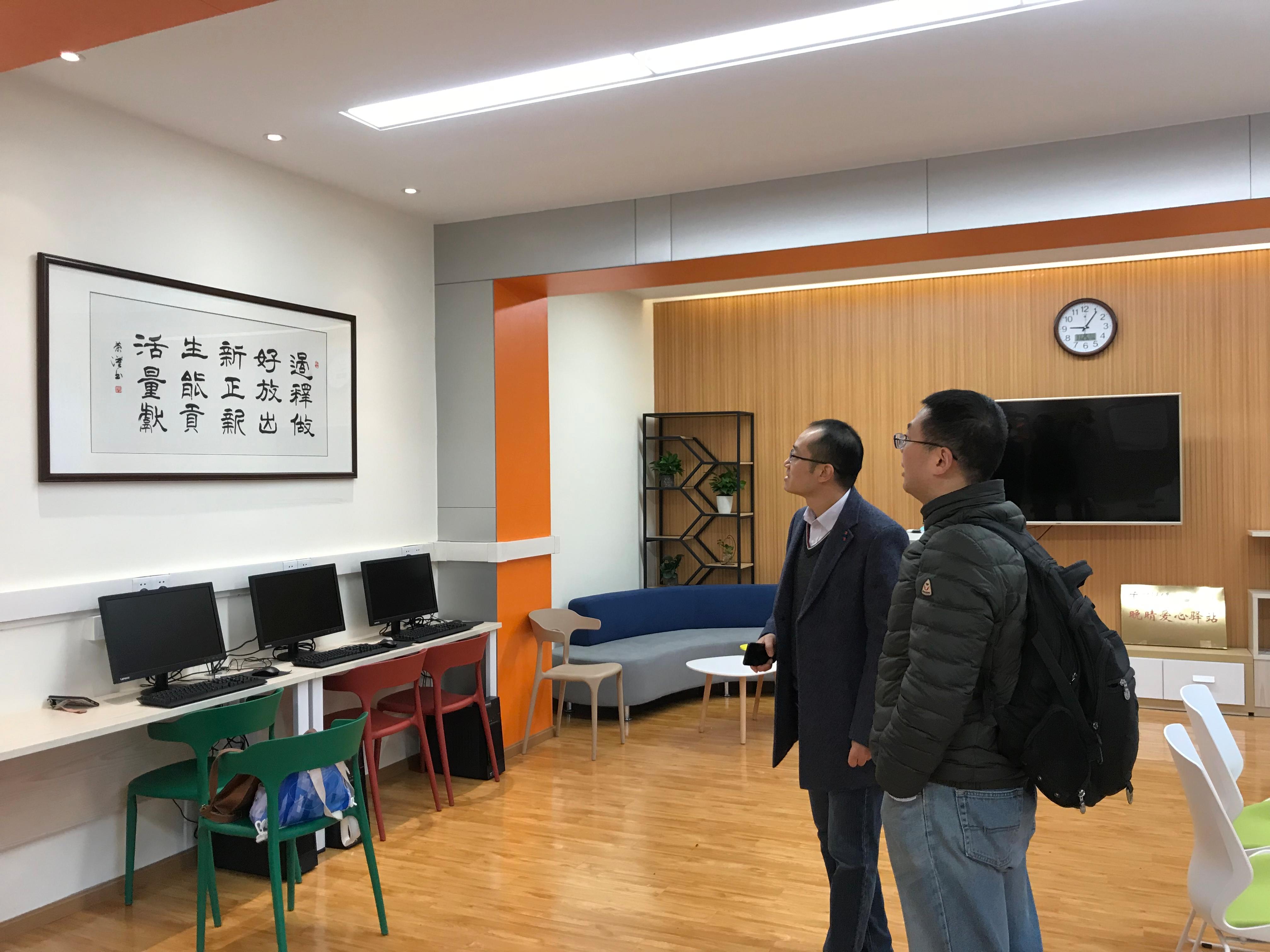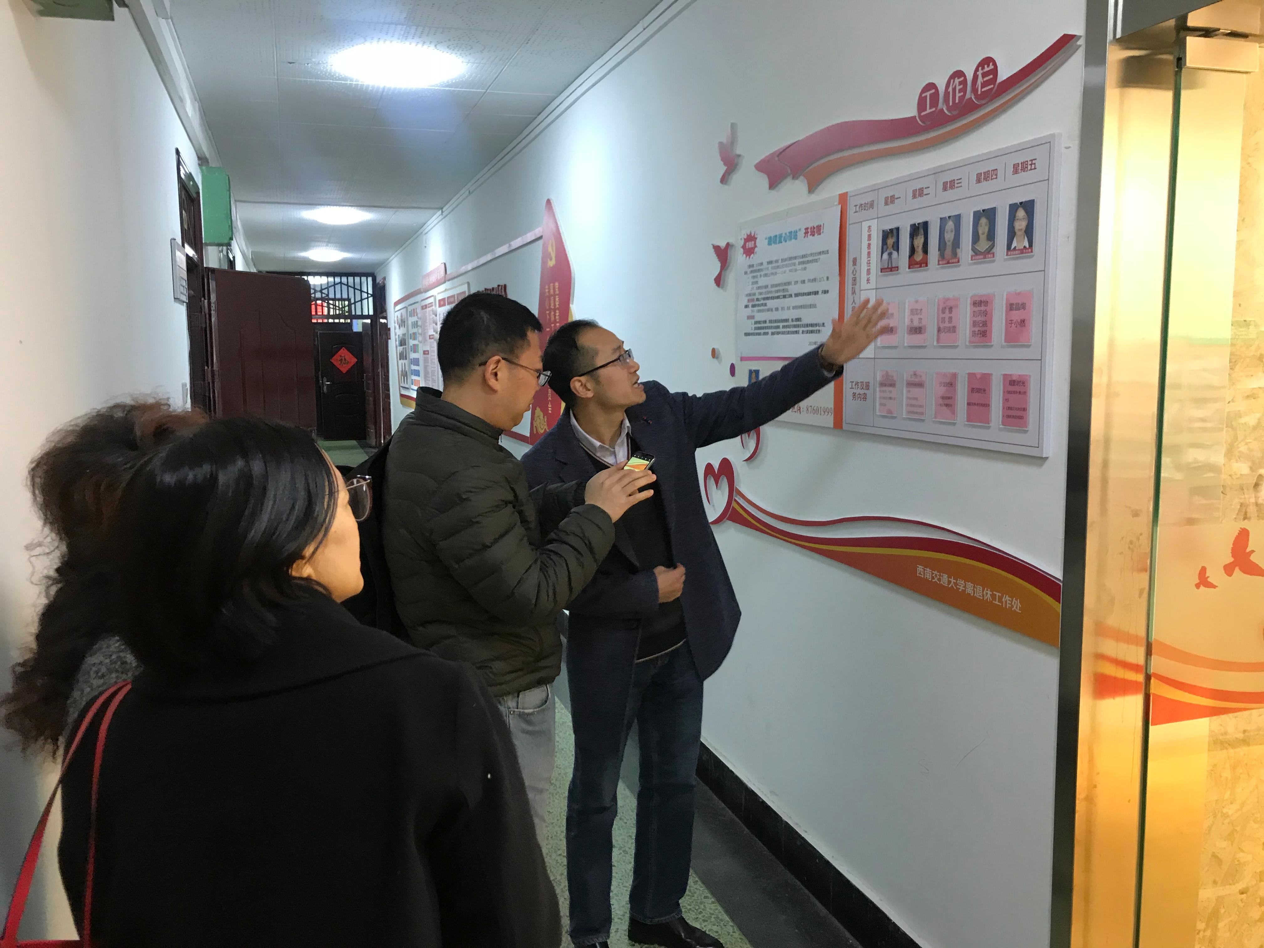 2019年11月25日上午,电子科技大学离退处党委书记、处长罗东率副书记刘玉君、办公室主任张和平一行三人到我校离退处进行考察,重点调研我校新开站的“晚晴爱心驿站”工作,并对双方关心的问题进行了深入的交流。
