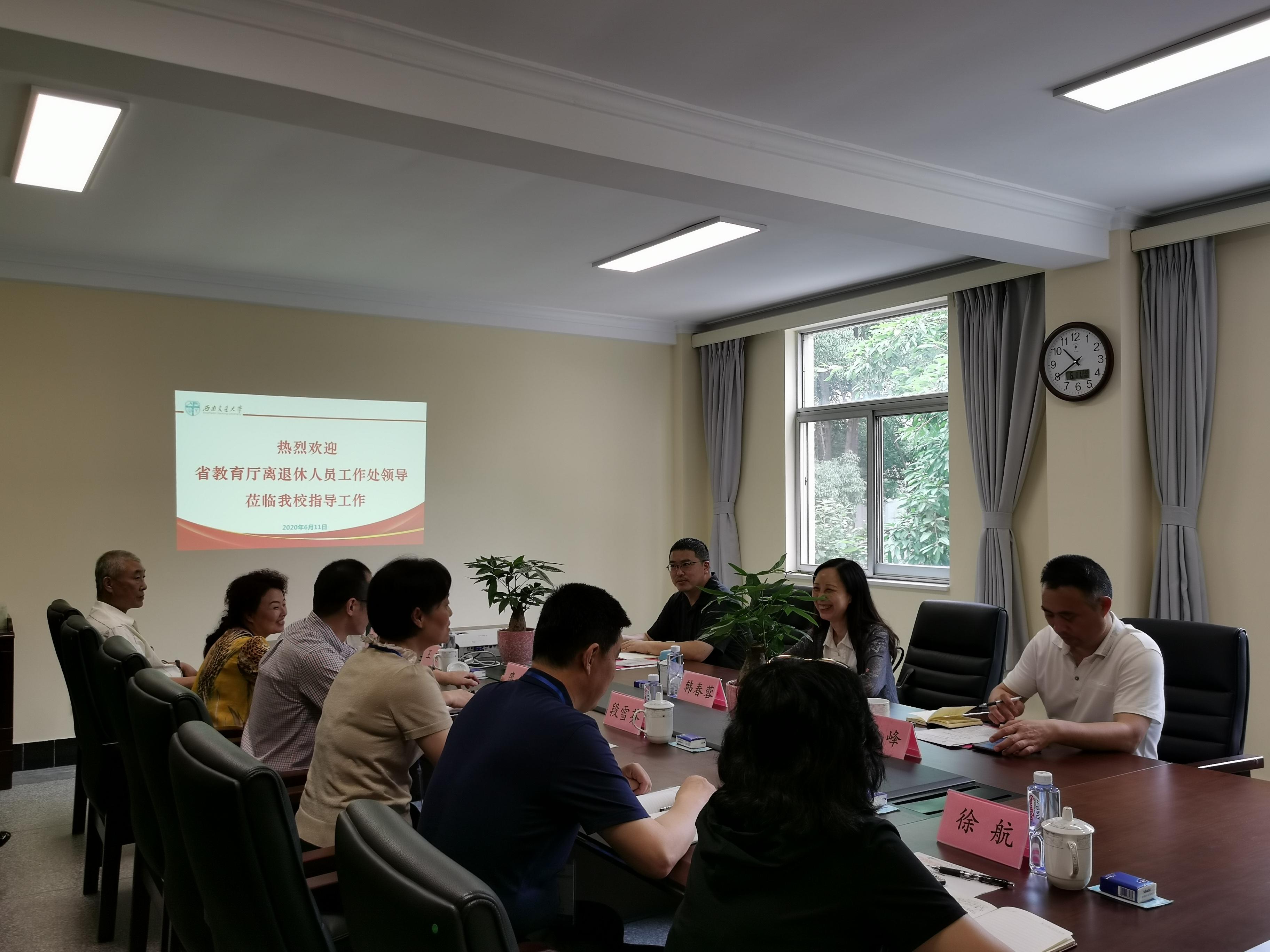 2020年6月11日上午,四川省教育厅离退休人员工作处处长韩春蓉、副处长戴峰、四级调研员吴毅一行三人,来到西南交大离退处调研检查、指导学校离退休管理与服务相关工作。