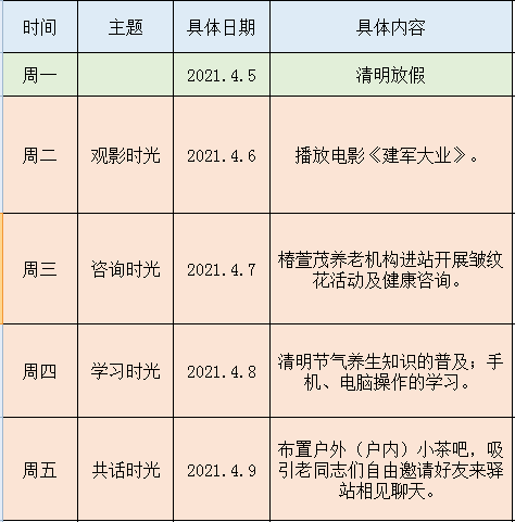 晚晴爱心驿站4月6日至9日活动安排: