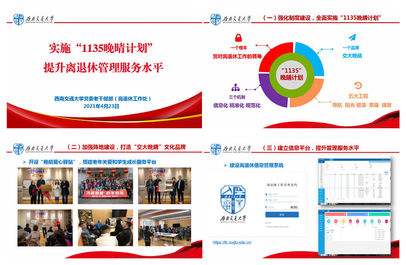 近年来,学校党委高度重视离退休干部工作,把离退休工作作为学校党建工作的重要组成部分,制定出台了《关于进一步加强和改进离退休工作的实施意见》(西交党〔2019〕56号),即“1135晚晴计划”,明确要“坚持党对离退休工作的领导”这一根本、打造“交大晚晴”这一品牌、健全“信息化”“精准化”“规范化”三个机制、实施“领航”“阳光”“健康”“幸福”“银发”五大工程,全方位加强和改进离退休工作。学校提高离退休工作在二级党组织年度党建考核中的分值占比,全面落实离退休老同志政治待遇、生活待遇,不断推进实施“银发工程”,加大对成峨两地晚晴苑老年活动中心软硬件环境改善提升的投入,不断营建“交大晚晴”老龄文化氛围,切实凝练和集聚“交大晚晴”老龄文化品牌效应,在离退休老同志思想引领、服务保障、作用发挥等方面取得了积极成效,得到教育部离退休干部局和四川省委教育工委的充分肯定。