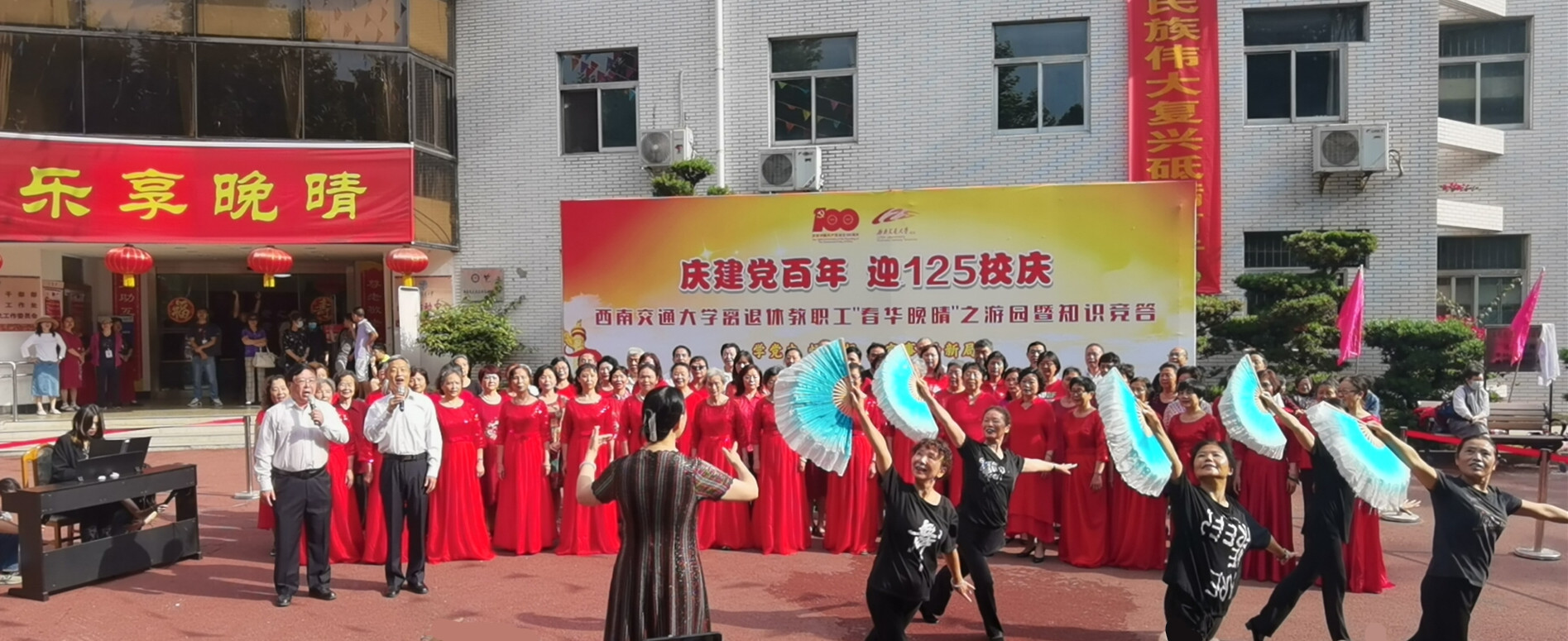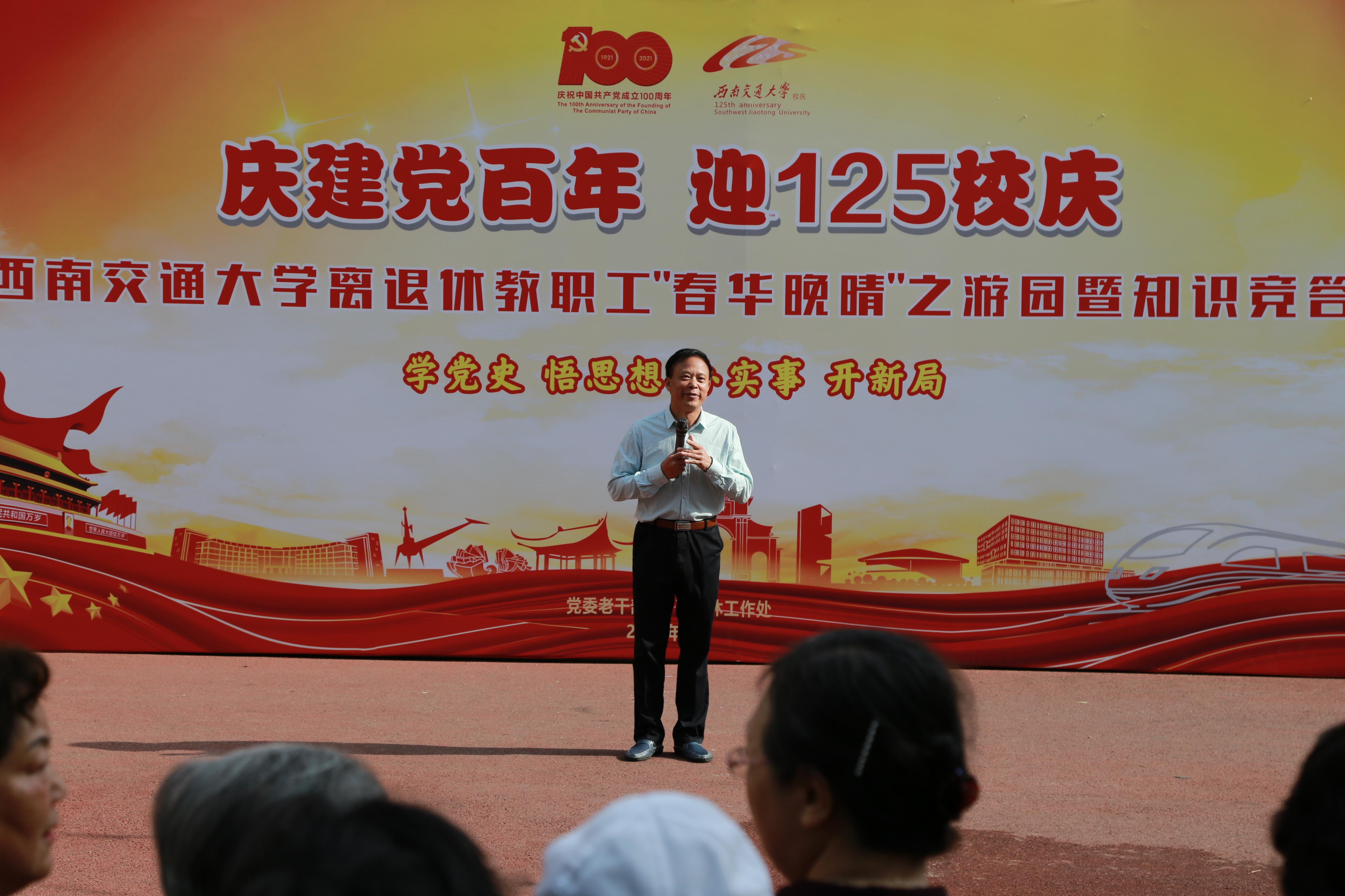 为丰富老同志的精神文化生活,弘扬正能量,在热烈庆祝建党百年,喜迎我校建校125周年,全校扎实开展党史学习教育之际,2021年5月11日上午,党委老干部部、离退休工作处在九里校区晚晴苑面向全校离退休教职工举行“春华晚晴”之游园暨知识竞答活动和第二届“成都市养老机构进交大”联展活动。全校千余名离退休教职工踊跃参加。校党委副书记桂富强出席活动并致辞。党委老干部部部长、离退休工作处处长廖军主持开幕式。