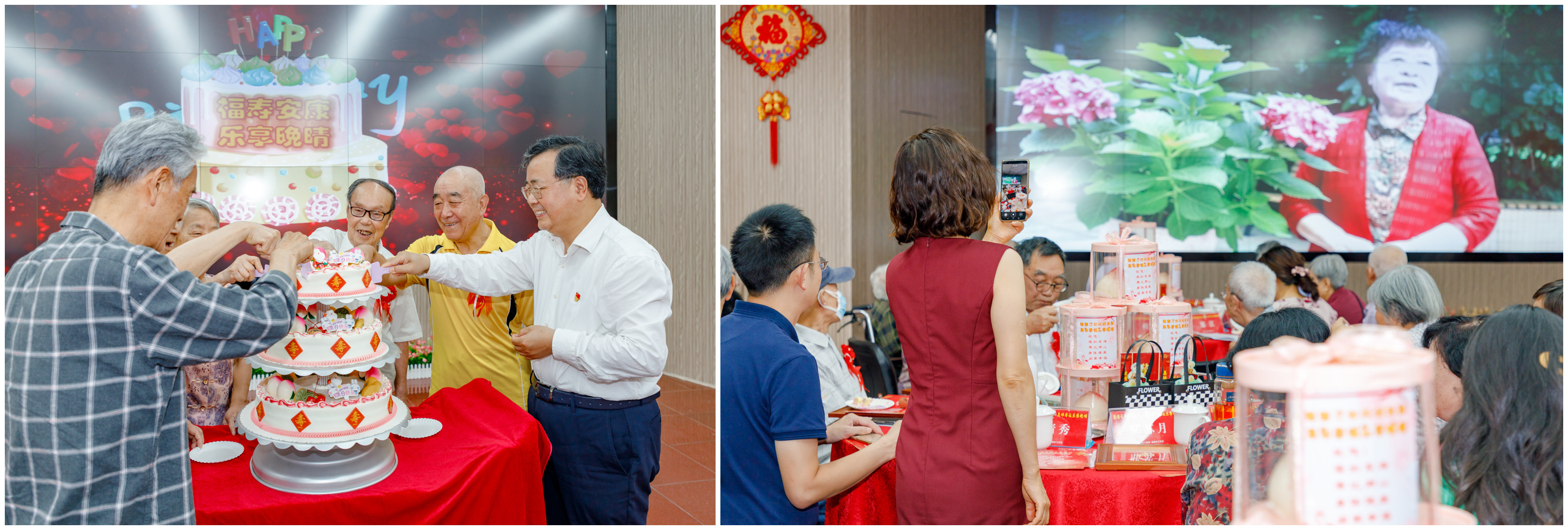 合唱生日歌后,王顺洪与寿星代表一起切蛋糕,在场的寿星们一起欣赏了由离退休工作处精心制作的展示寿星们昔日荣光和今日风采,以及对党和学校表达祝福的《岁月鎏金》、《一路前行》音乐短片。