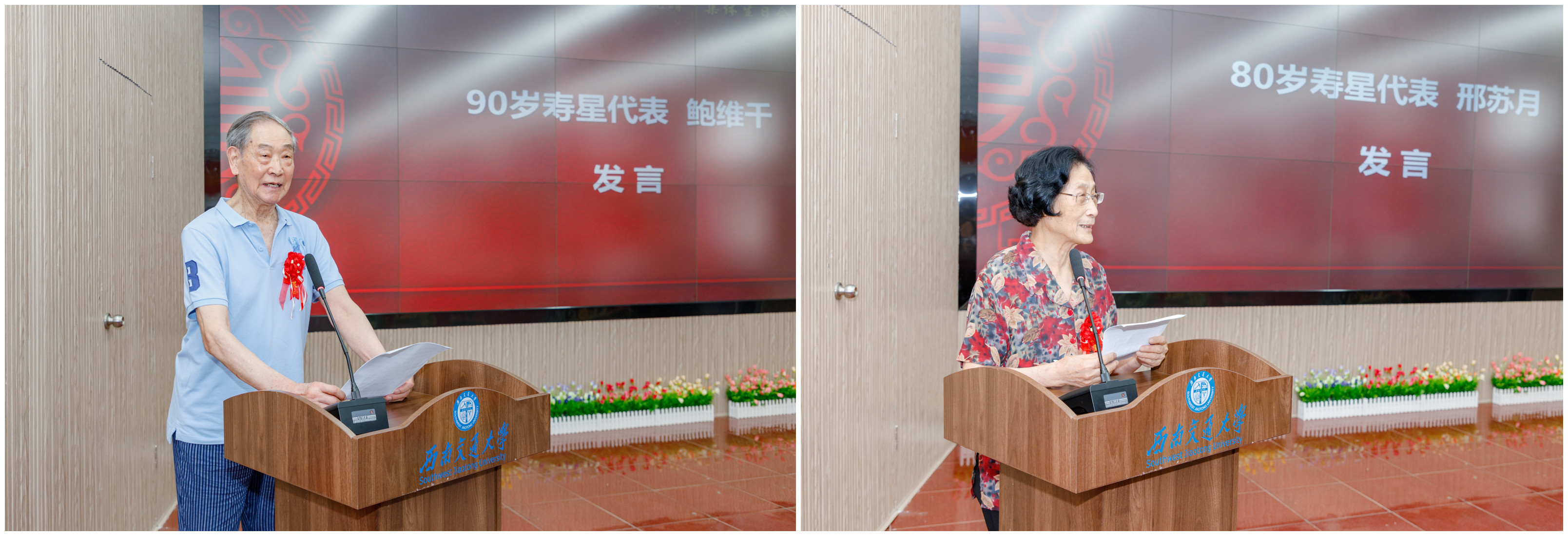 校工会主席郑江代表机关部处和附属中学党总支书记朱剑松代表二级党组织分别发言,为老寿星们送上诚挚的祝福。