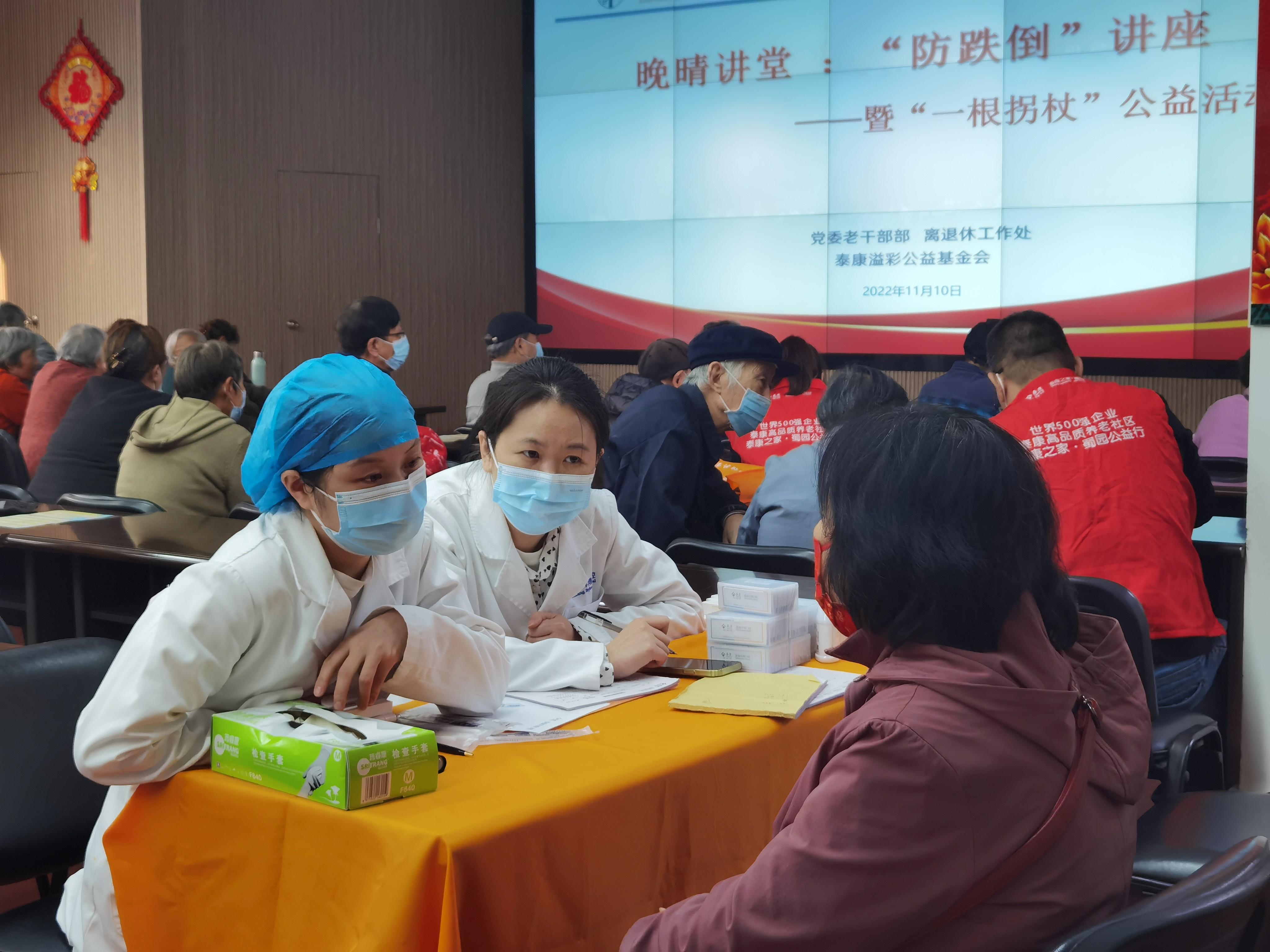 随后,泰康溢彩公益基金会志愿者介绍了“一根拐杖”公益活动项目的背景,该项目联合中华社会救助基金会共同发起,通过医学科普、志愿服务、公益倡导等多种形式,提高整个社会对老年人防跌倒的关注度,以及科学应对跌倒发生后的相关措施,并由泰康溢彩志愿者在全国落地执行。