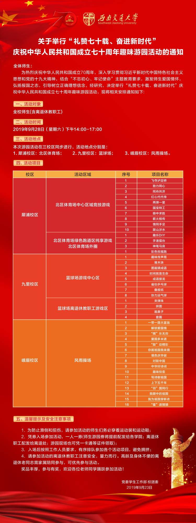 转发党委学工部和团委关于举行“礼赞七十载、奋进新时代”庆祝中华人民共和国成立七十周年趣味游园活动的通知