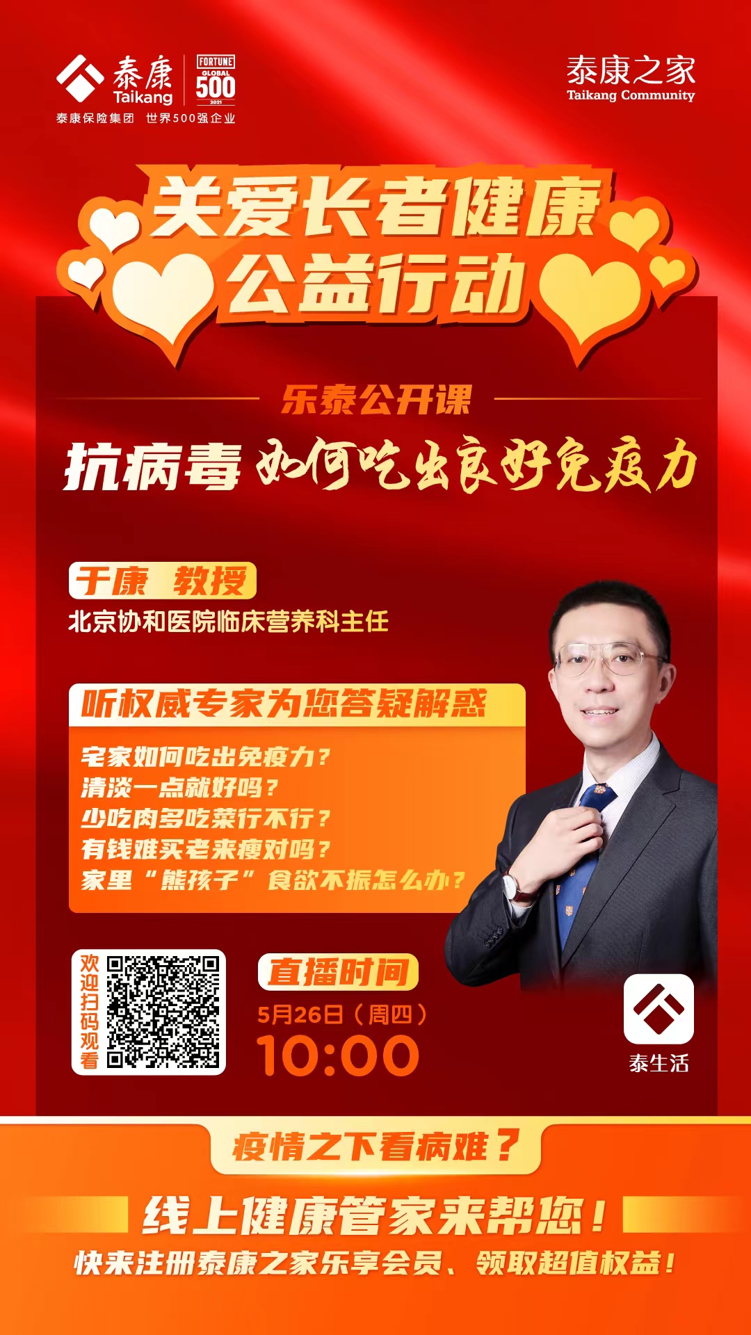 泰康之家隆重推出·关爱长者健康公益行动·系列讲座《抗病毒如何吃出良好免疫力》,锁定周四上午10:00,守护您的健康。