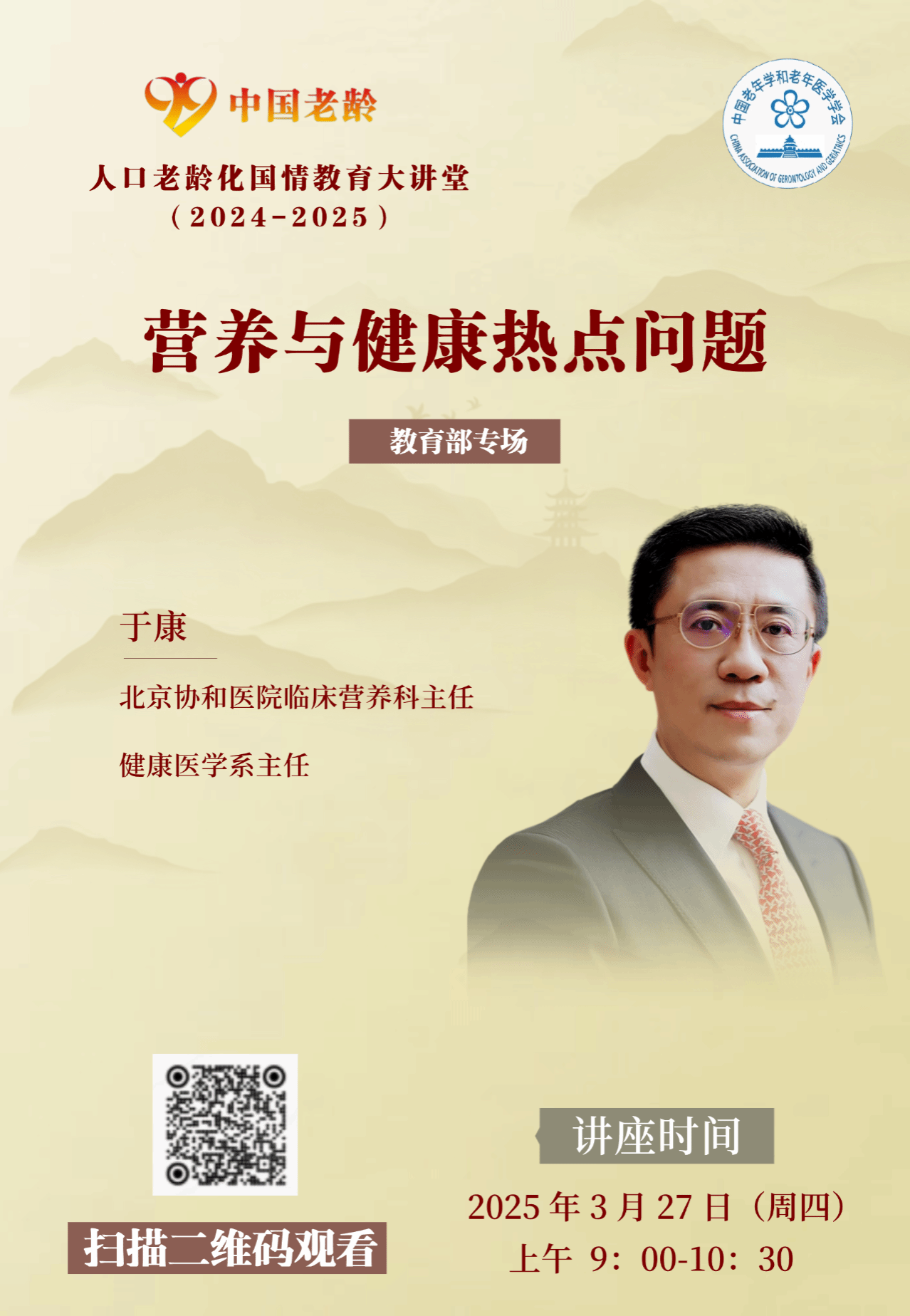 “人口老龄化国情教育大讲堂(教育部专场)”暨教育部离退休干部局2025年第一季度健康讲座,开讲啦!特邀北京协和医院临床营养科主任、健康医学系主任于康主任医师、教授主讲。