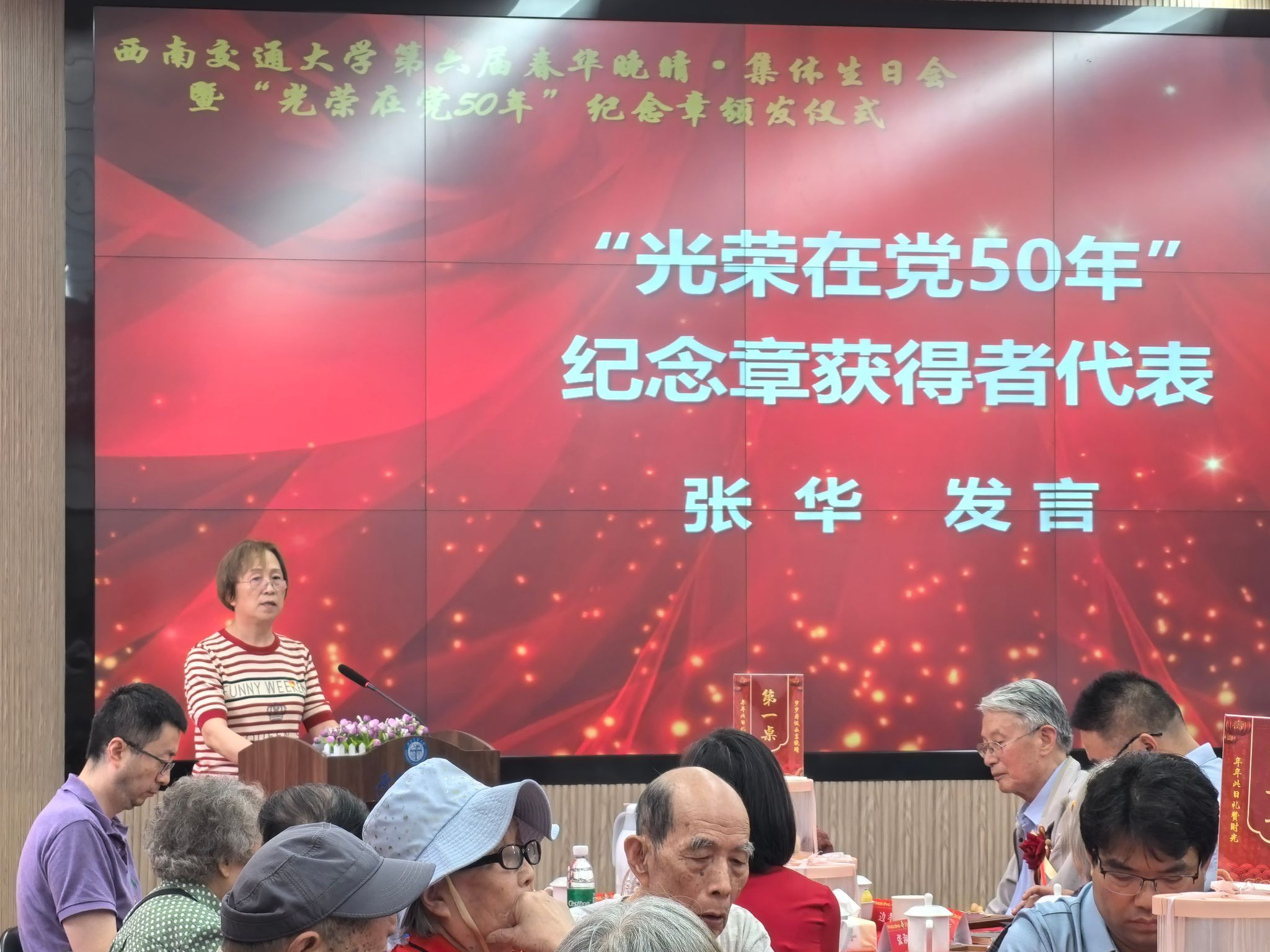 “光荣在党50年”纪念章获得者,原组织部部长张华同志代表老党员们发表感言。她感慨:“今天是党的生日,在这么重要的时间节点,参加光荣在党50周年纪念章颁发仪式,我心潮澎湃”。她回忆了自己入党50年来的风风雨雨,从年幼到长大、从峨眉到成都、从争取入党到成为一名正式党员,几十年来,对党忠诚、热爱,听党话,跟党走的初心是镶嵌在骨头里,流淌在血液里始终没有变过,并表示自己一定保持初心,牢记使命,退休不褪色,继续关心和支持学校的改革发展,为学校高质量发展增添正能量,作出新贡献。
