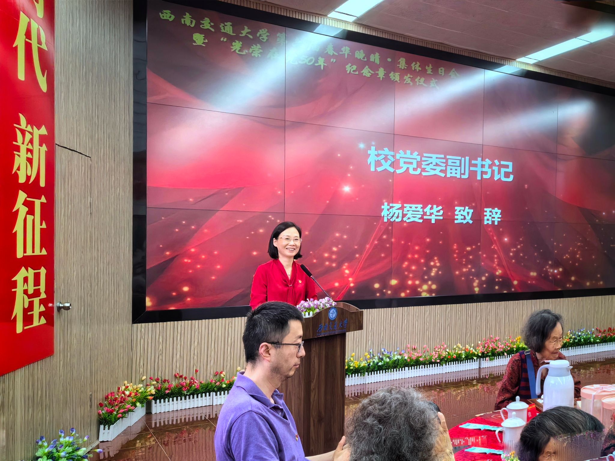 杨爱华指出,离退休老同志是学校发展的亲历者、实践者和见证者,为党和国家教育事业,为学校发展付出了辛勤劳动和汗水,退休后仍然一如既往地关心关注学校发展,为学校发展建言献策,为建设教育强国、续写交大篇章无私奉献。杨爱华谈到,在学校老党员身上,我们看到了共产党员对共产主义事业的信仰和坚守,对建设国家、忠诚教育事业的担当和大爱,真切感受到了老交大人永不褪色的赤诚之心和矢志不渝的交大精神,老党员、老教师用实际行动证明了——教师是学校发展的最大资源、是学校办学的最大底气。杨爱华强调,希望各位老党员、老同志,继续发挥模范带头作用,始终坚持共产党员的先锋模范本色,不忘初心、牢记使命,自觉以习近平新时代中国特色社会主义思想凝心铸魂,涵养清风正气,传承优秀传统,离岗不离党,退休不褪色,继续竭尽所能发光发热,为年轻党员干部做好榜样,为党旗增光添彩!
