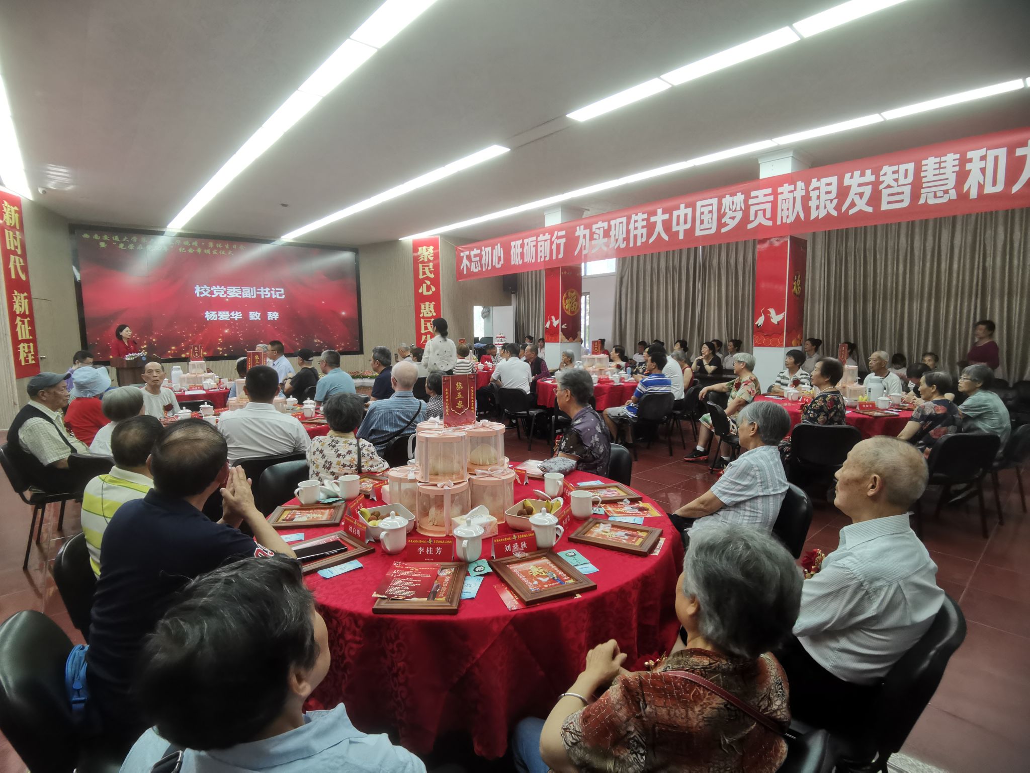 杨爱华代表学校党政,代表学校党委书记余敏明、校长闫学东,向学校离退休党员同志致以节日的问候!向获得“光荣在党50年”纪念章的老党员同志们致以热烈的祝贺!向全体离退休老同志致以亲切问候,向学校今年满80岁、90岁整的86位老寿星送上最美好的祝福!祝大家身体健康!寿比南山!松柏长青!万事如意!