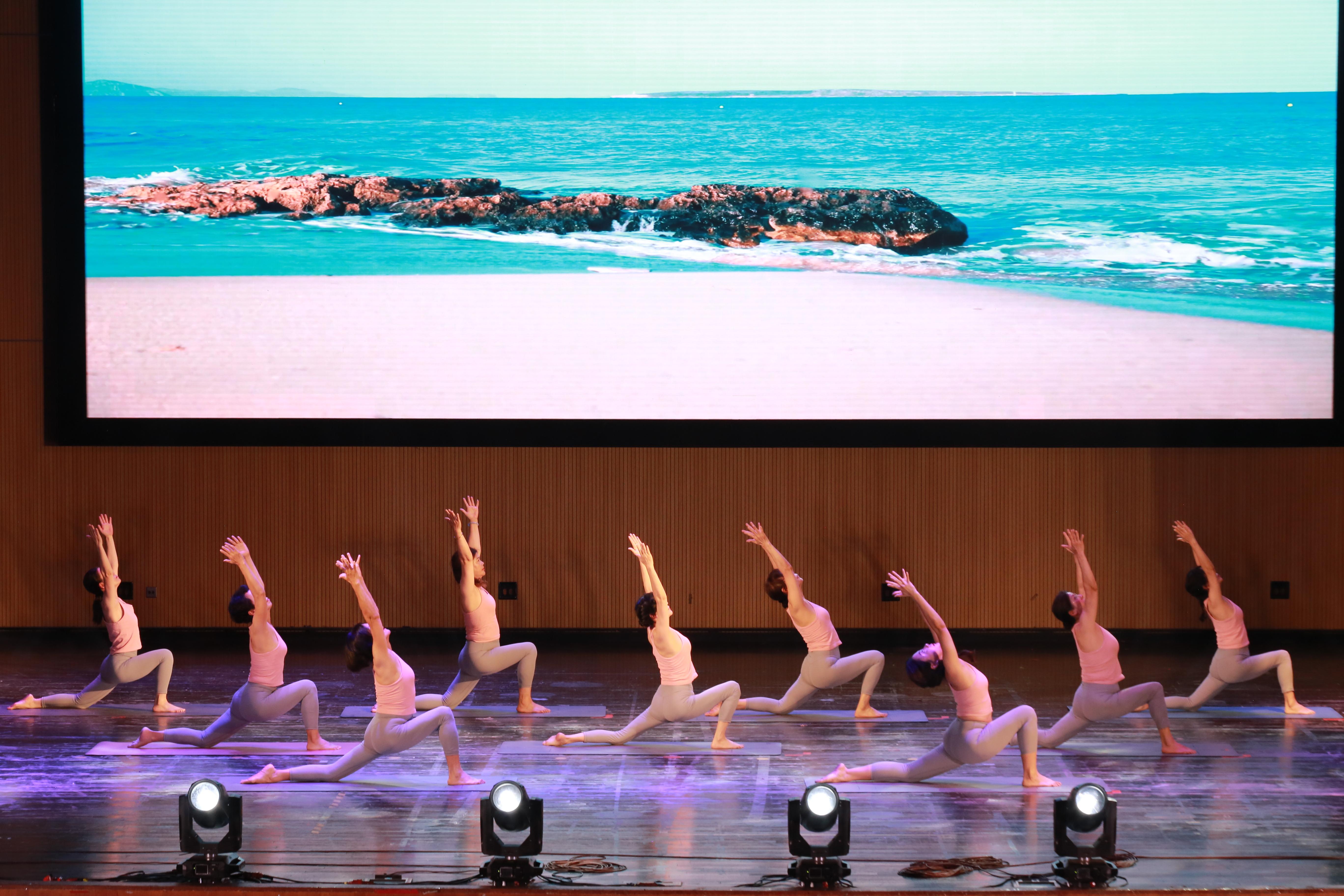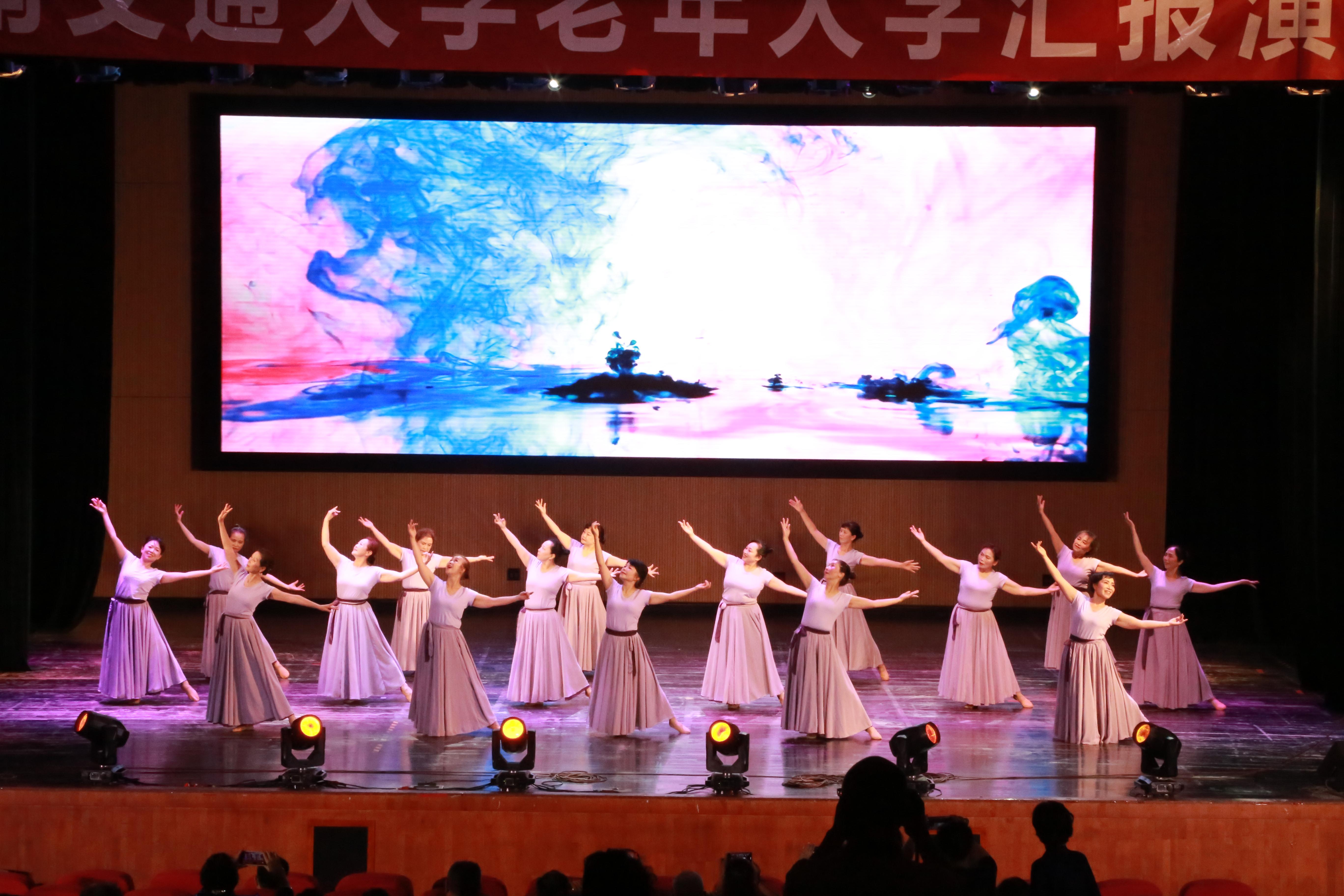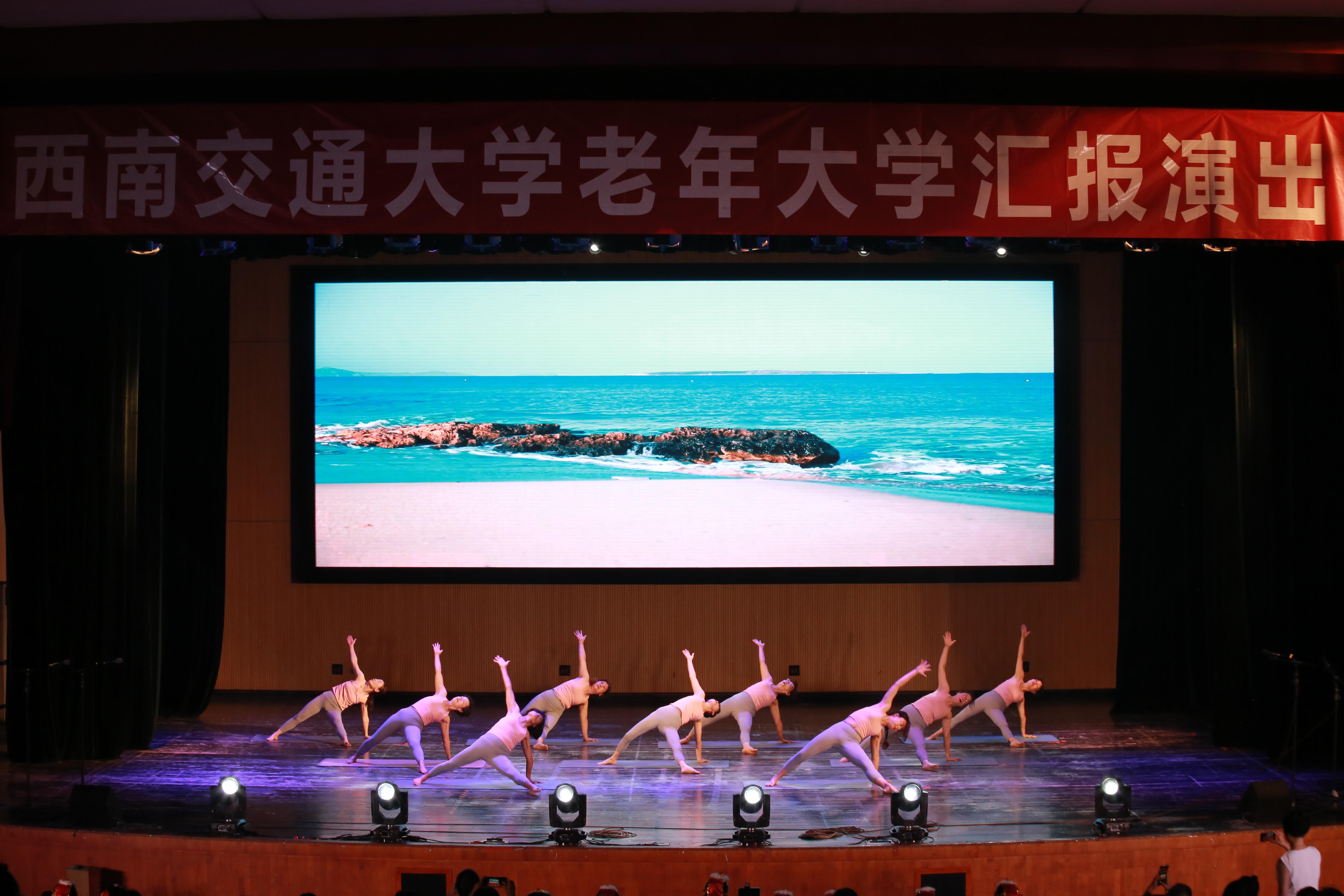 621日,我校老年大学2023年文艺汇报演出在九里校区大学生会堂举行。190余名学员用歌声、舞蹈、健康、热情诠释了“阳光生活乐享晚晴”的意义。文艺汇报演出共三幕十八个节目,有合唱、舞蹈、京剧、走秀、流瑜伽、太极扇等多种表演形式,其中,流瑜伽作为众多女学员喜爱的健身项目,经过艺术加工后在舞台上展示。