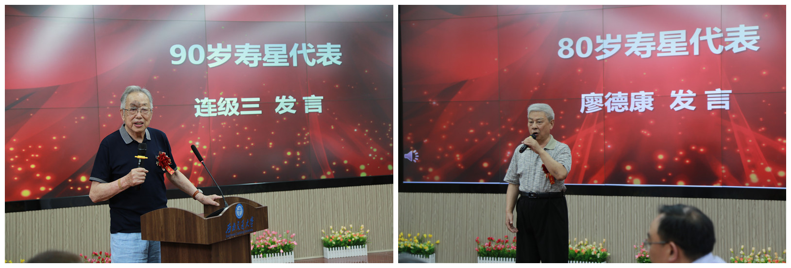 学校原电气工程学院连级三教授和研究生院廖德康老师分别代表学校79位90岁、80岁寿星发言。他们结合自身学习、工作、生活经历,回顾了自己与交大共成长的故事,表达了对党的热爱,对学校的感恩,希望学校发展越来越好,时刻准备为学校建设发挥余热。廖德康老师发言后即兴为大家演唱《我爱你中国》。