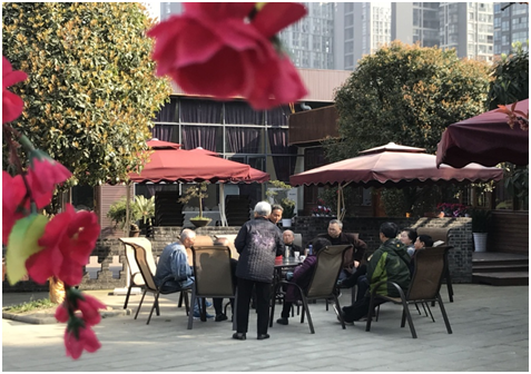 紫御轩,是一个农家园林式庄园,树木葱笼,环境幽静。走进紫御轩,老同志们发现此庄园还挺大,树绿、气清、亭雅。在一步一景的小花园里,杜鹃花、山茶花、桃花、梨花竞相开放,姹紫嫣红,在绿树青草的衬托下,煞是好看。在暖暖的阳春下,老同志们晒着太阳,聊天、喝茶、下棋、打牌,惬意极了。