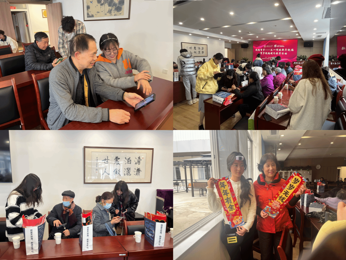 活动期间,为协助老教师拍摄新年祝福视频,学生们与退休教职工进行深入交流,分享如何拍摄和制作小视频。同学们在场地摆设、音乐选择、软件使用等方面,向老教师们提供了建议和帮助。老教师们也向交大全体师生送出新年祝福:“祝同学们学业有成,祝大家万事如意,新年快乐,文轨车书郅大同。”亲切的祝福语中,包含了老教师对同学的殷切期望和对全校师生的浓浓关怀。