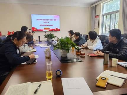 会议开始,由在职党支部书记李彤梅同志组织全体党员进行《中国共产党组织工作条例》党课学习,条例填补了党内法规中关于组织工作的空白点。李彤梅书记通过《条例》的背景和意义、主要框架和制定原则、主要内容三个方面,详细解读了2021年印发的《中国共产党组织工作条例》最后结合条例谈了学习感悟:在思想淬炼中筑牢“革命理想高于天”的政治灵魂;在政治历练中提高“风雨不动安如山”的政治本领;在实践锻炼中提高“泥犁拔舌自担当”的专业能力;在专业训练中培养“咬定青山不放松”的专业精神。