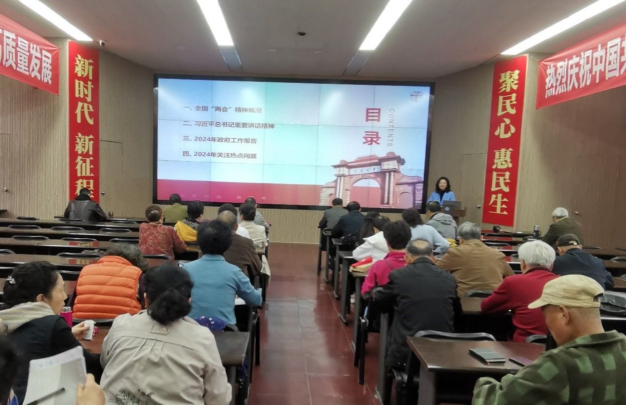 一是离退处党委书记蒋佳同志向全体参会老同志们传达十四届全国人大二次会议和全国政协第十四届全国委员会第二次会议(以下简称”两会“)精神。传达会”两会“概况、习近平总书记在”两会“期间发表重要讲话情况、政府工作报告和今年热点问题关键词等方面对主要内容进行了宣传和学习。会议强调今年全国两会是在中华人民共和国成立75周年,实现“十四五”规划目标任务关键一年召开的十分重要的大会,是高举旗帜、真抓实干、团结奋进的大会。习近平总书记在会议期间发表的重要讲话,深刻阐明事关中国式现代化建设的重大问题,为党和国家事业发展进一步指明了方向、提供了根本遵循。