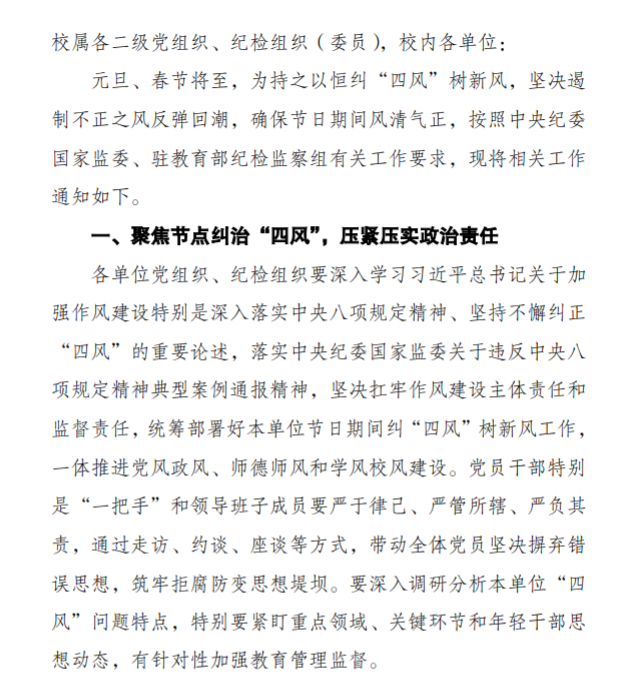 关于做好2025年元旦春节期间纠“四风”树新风工作的通知