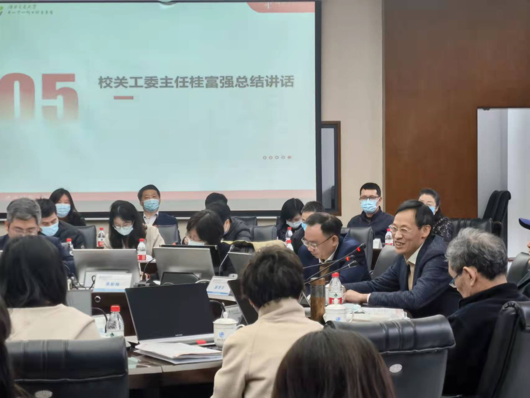 桂富强在总结讲话中指出,站在第二个百年奋斗新起点上,关工委工作被赋予了新时代的责任与使命,做好关工委工作关系着党的事业薪火相传,责任重大,使命光荣。他就做好学校关工委工作提出要求。一是学好文件,认真研读习近平总书记的重要批示指示,中办、国办印发的《意见》,以及教育部党组34号文件,通过系统学习、深刻理解关工委工作的内在逻辑,把握关工委工作机制,明确关工委工作方法。二是搭好架构,按照学校关工委“五五工程”要求,完善二级关工委的体系架构,切实保障二级关工委工作有人管、有事干、有考核、有成效。三是融入体系,将关工委工作融入“交大风格、五育并举、面向未来”的育人体系,鼓励和支持老同志全方位融入时代新人培育工程。四是连好供需,把控“关工委师资库”资源和产品输出质量,充分调研“大中小”不同阶段学生特点,让关工委工作更符合新时代青少年发展需求。五是把控节奏,把握学校整体育人体系脉络,发挥关工委的特殊优势,有力补位。六是建好品牌,借助教育部关工委活动品牌,挖掘学校精神内核,构建交大工作品牌。七是求得实效,通过关工委工作的深入开展,让老同志获得成就感,实现人生价值,让青年学生得到思想上的升华,心灵上的触动,能力上的提高,格局上的扩大,起到实实在在的作用与成效。