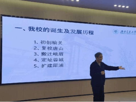 梁锦堂老师以时间为序,生动详实地讲述了我校的诞生及发展历程和我校校友的光荣杰出事迹,一张张极具历史价值的老照片诉说着当年的光辉岁月,一件件泛黄的历史文物再现着当年的风采。从初创榆关到复校唐山,再到搬迁峨眉定址蓉城,我校在一次次校址变迁中创造了历史,为祖国输送了无数人才栋梁。梁锦堂老师还讲述了我校校训“竢实扬华”的由来。表达对我校学子脚踏实地,振兴中华的殷切期望。